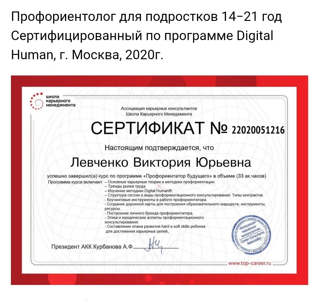 Семейный профориентолог подростков и взрослых (Академия Людмилы Салоид, Школа карьерного менеджмента "Профориентатор подростков" и "Профориентатор взрослых").