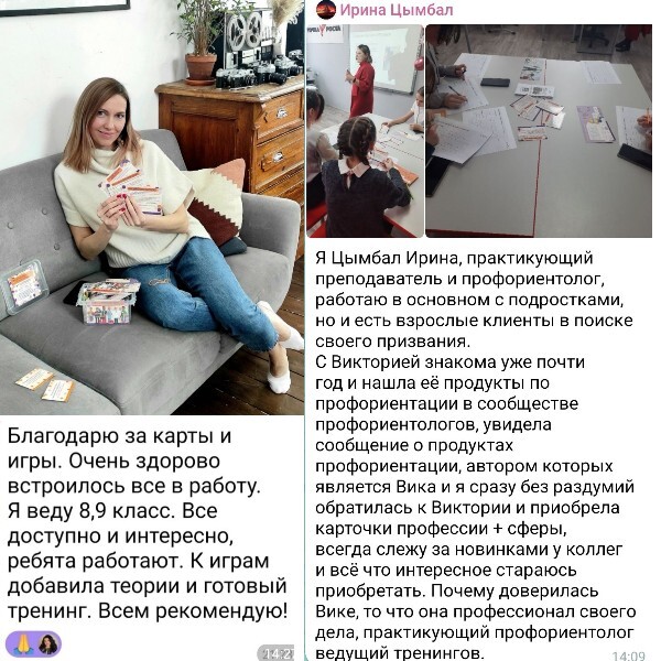 Я прошла много обучений по ведению консультаций, программ, групп в профориентации и получила много опыта внедрения этих знаний, прежде чем начинать делиться своими продуктами с коллегами.